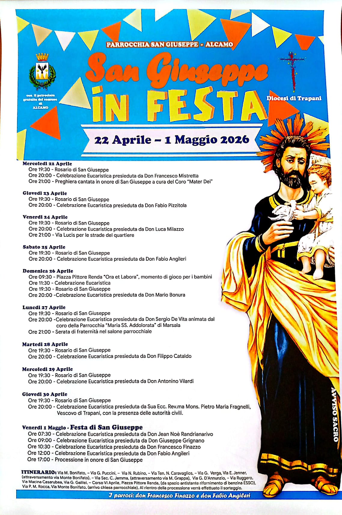 A partire da ieri e fino al 1° maggio, sono in corso, con il patrocinio del Comune di Alcamo, i Festeggiamenti dedicati a San Giuseppe Lavoratore anno 2026 della Parrocchia di San Giuseppe, via Monte Bonifato.