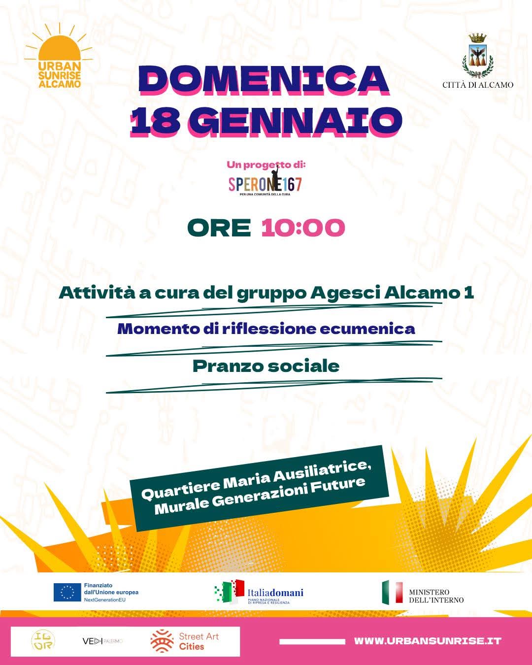 Mentre Domenica 18 gennaio dalle 9:00 alle 16:00 (circa) presso il Quartiere Maria Ausiliatrice – Murale “Generazioni Future”, un momento comunitario con attività educative a cura del gruppo AGESCI Alcamo 1, riflessione ecumenica e pranzo sociale informale.