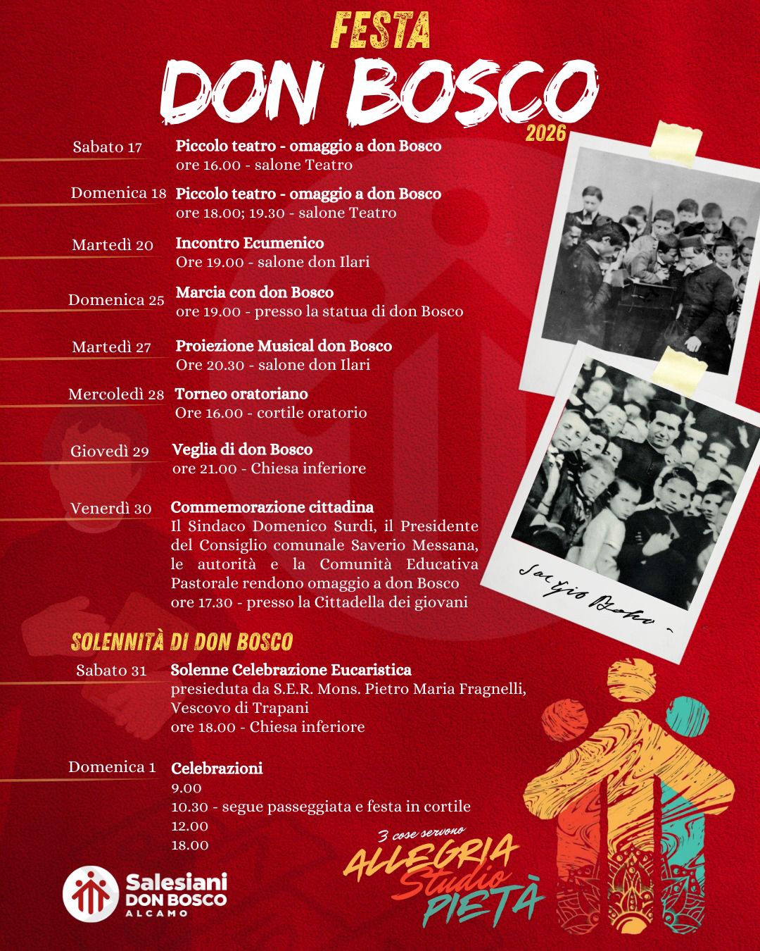 Oggi pomeriggio a partire dalle 17.30 alla Cittadella dei Giovani, il Sindaco Domenico Surdi, il presidente del Consiglio Saverio Messana e il vice Sindaco Alberto Donato parteciperanno, insieme alla comunità educativa pastorale, alla cerimonia in omaggio di Don Bosco, nell’ambito della Festa Salesiana anno 2026.