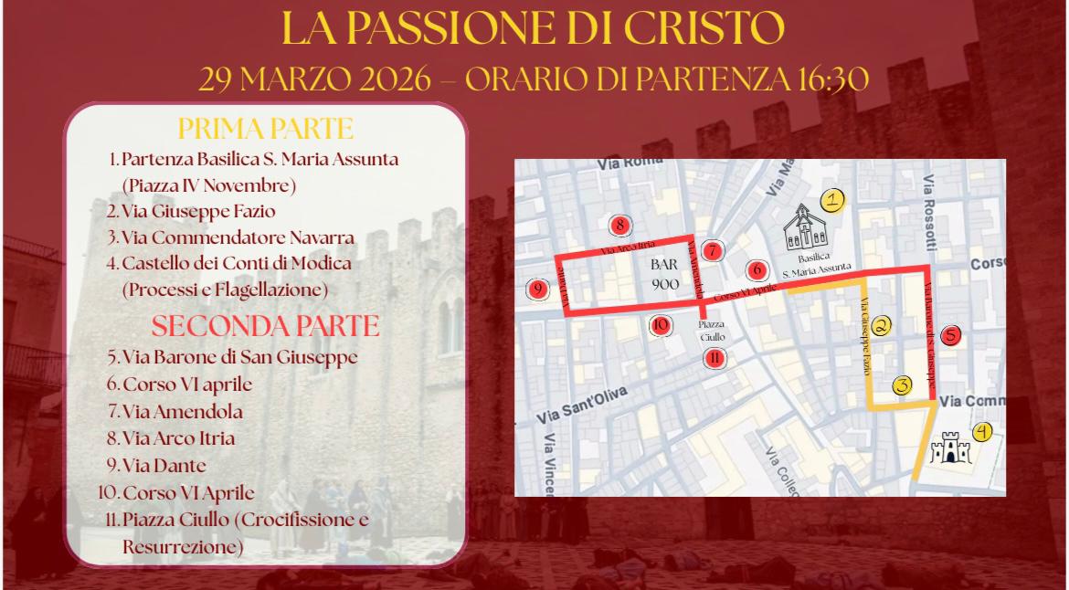 L’inizio della rappresentazione è previsto alle 16:30 nei pressi della Chiesa Madre, piazzetta IV Novembre, via Fazio, via Comm. Navarra, Castello dei Conti di Modica (Processi e Flagellazione) via Barone San Giuseppe, corso VI Aprile (stretto) via Amendola, via arco Itria, via Dante, corso VI Aprile (largo) per concludersi in piazza Ciullo con il Cristo in croce e la Resurrezione.