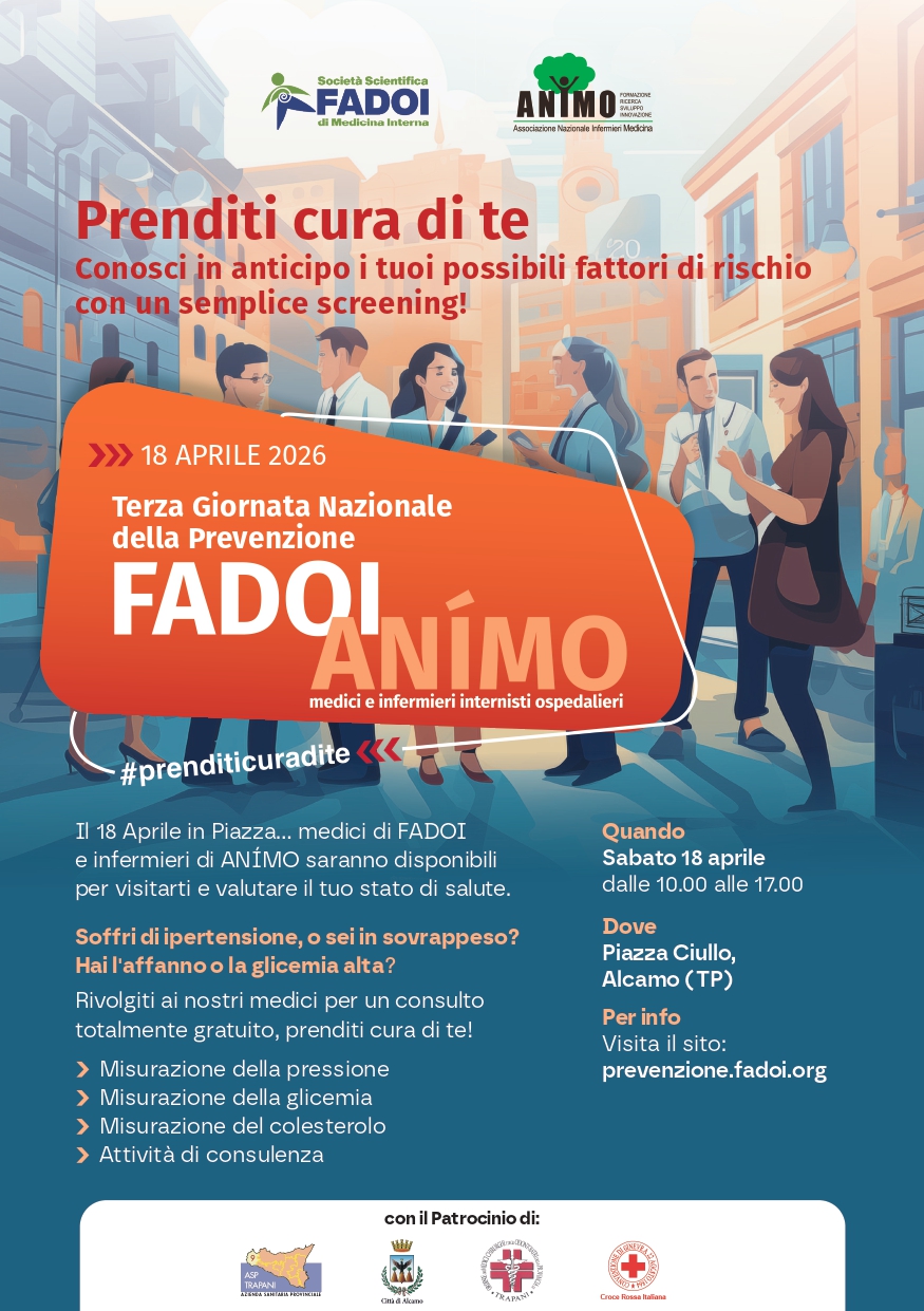 La Fondazione FADOI, Federazione delle Associazioni dei Dirigenti Ospedalieri Internisti, insieme ad ANIMO, Associazione Nazionale degli Infermieri di Medicina, promuove anche quest’anno, la Giornata nazionale della prevenzione che si terrà il 18 aprile 2026 in circa 20 piazze italiane.