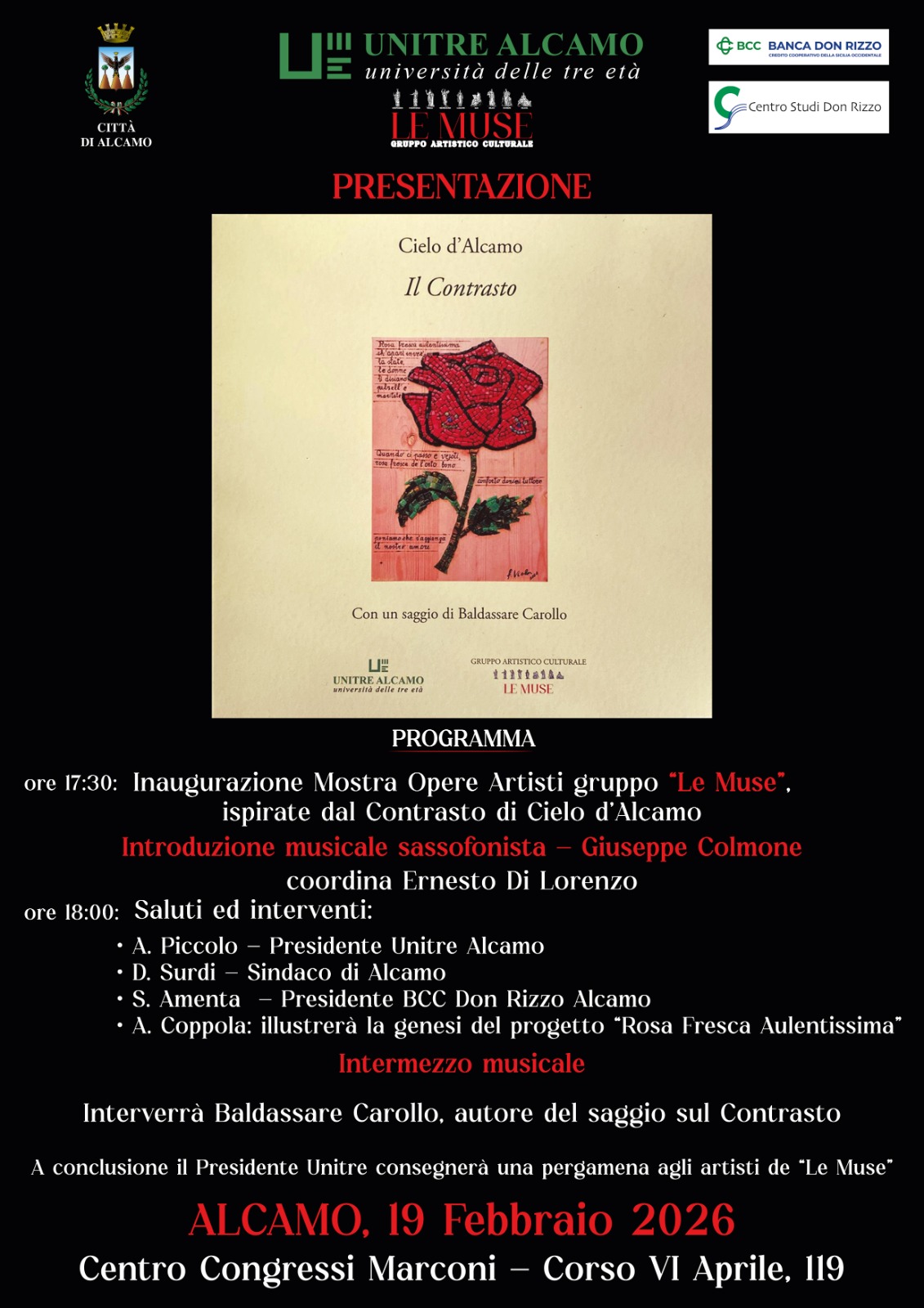 E’ prevista, inoltre, l’esibizione musicale del sassofonista Giuseppe Colmone sia all’inizio che durante l’intermezzo dei lavori; ad intervenire ci saranno il Sindaco Domenico Surdi, il presidente dell’Unitre di Alcamo, Nino Piccolo, il presidente della Banca Don Rizzo Amenta ed infine il dott. Coppola parlerà del progetto “Rosa Fresca Aulentissima”.