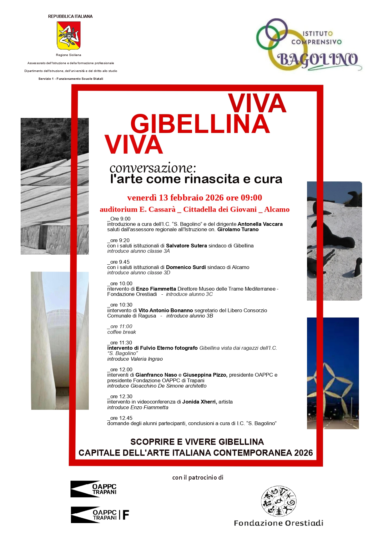 L’appuntamento di venerdì 13 rientra fra le iniziative proposte (visite guidate a Gibellina; Workshop e laboratori didattici e artistici; lezioni sull’arte e architettura contemporanea; momenti di confronto, etc) dal progetto “VIVA GIBELLINA VIVA” Scoprire e vivere Gibellina, capitale italiana dell’arte contemporanea, organizzato dall’I.C. “S. Bagolino” di Alcamo.