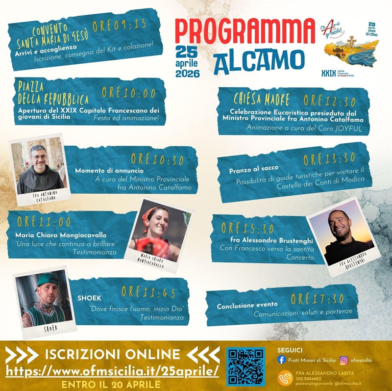 “Chiamati a cose grandi! con Francesco verso la santità”, questo il titolo del XXIX Capitolo Francescano dei Giovani, organizzato dalla Pastorale Giovanile dei Frati Minori di Sicilia in collaborazione con l’ufficio Cultura del Comune di Alcamo, sabato 25 aprile, in Piazza della Repubblica.