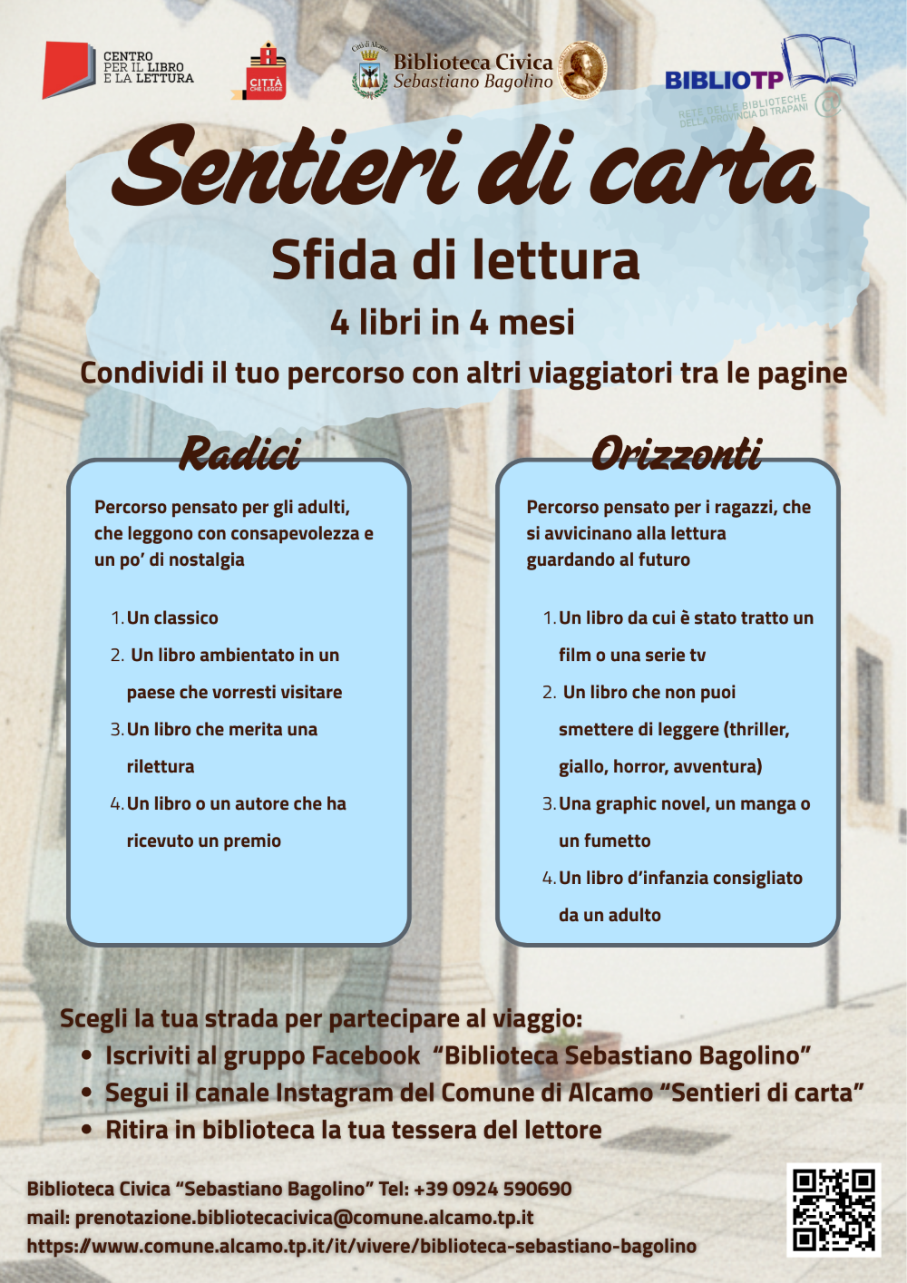 La sfida prevede 2 percorsi di lettura: il primo pensato per gli adulti, il secondo per i ragazzi; per partecipare al viaggio, attraverso i libri, è possibile 1) iscriversi al gruppo Facebook “Biblioteca Sebastiano Bagolino”; 2) seguire il canale Instagram del Comune di Alcamo “Sentieri di carta”; 3) ritirare in biblioteca la propria tessera del lettore.